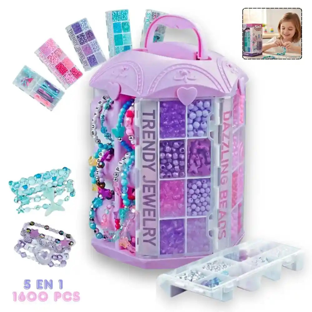 Si buscas un regalo práctico, creativo y lleno de posibilidades, este Kit de Manualidades 5 en 1 es ideal. Su estuche giratorio en forma de torre mantiene todas las piezas ordenadas, visibles y listas para usar, permitiendo que niñas y niños disfruten creando pulseras, collares y accesorios totalmente personalizados. Perfecto para tardes de juego, actividades en familia o proyectos escolares. Características principales -Estuche Torre 5 en 1 – Giratorio y Organizado -Diseño tipo torre con compartimentos transparentes. -Bandejas extraíbles para elegir piezas sin desorden. -Giro suave que facilita encontrar cada elemento rápidamente. -Asa superior para transportar cómodamente a cualquier lugar. -Fabricado en material resistente y apto para uso infantil. -Incluye más de 1600 piezas de colores -Elementos de bisutería grandes y pequeñas. -Perlas en tonos pastel y colores vibrantes. -Figuras decorativas y dijes temáticos. -Cordones elásticos de buena resistencia. -Accesorios para crear pulseras, collares y tobilleras. -Diseñado para potenciar la creatividad -Ideal para desarrollar imaginación y motricidad fina. -Perfecto para actividades en casa, talleres, juegos entre amigas/os o como detalle especial. -Permite crear accesorios únicos y personalizados. Contenido del kit 1 Torre giratoria 5 en 1 con tapa decorada. +1600 piezas variadas en formas, colores y tamaños. -Cordones elásticos para armar accesorios. -Bandejas organizadoras extraíbles.