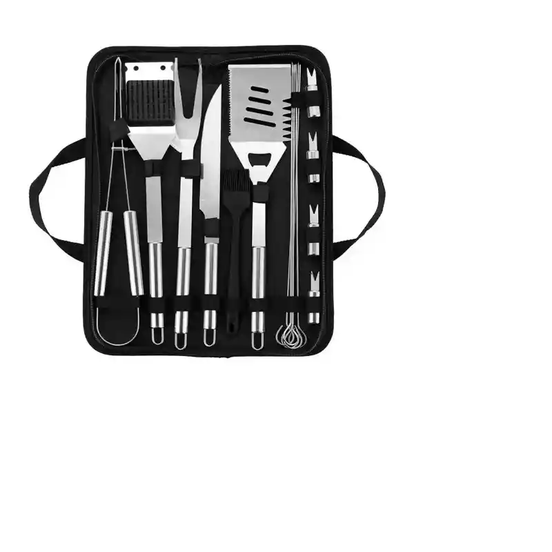Set de cubierto para asados, 15 piezas, espátula, pinzas, tenedor, cuchillo, cepillo de silicona, pinchos y soporte de maíz, en material de acero