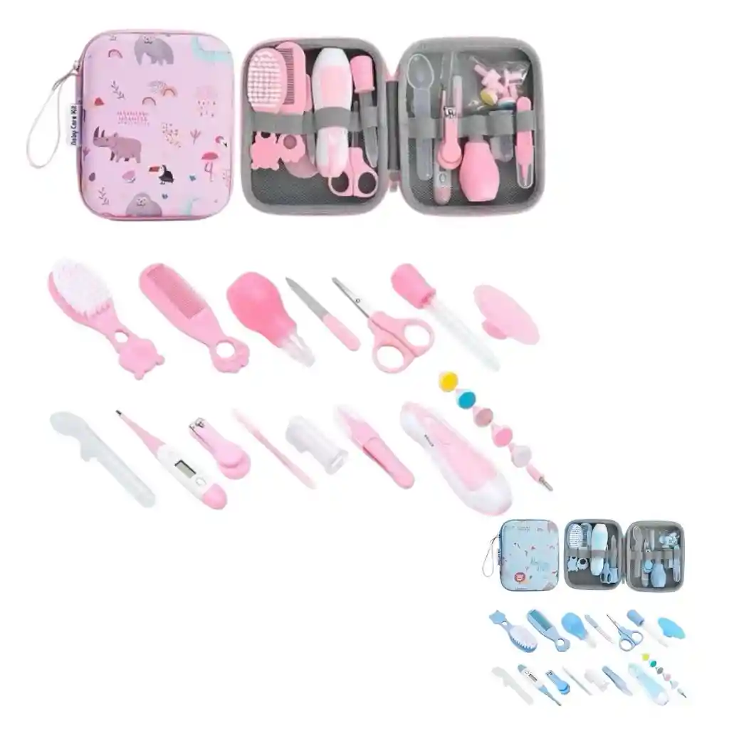 SET ASEO 20 PZS BDL5135 MUNBE Incluye: Lima eléctrica, con juego de cabezales intercambiables. (6 psc) Cepillo de dientes de dedo: 5,5 cm Cepillo: 12 cm Termómetro: 12 cm Pinzas: 8,5 cm Tijeras cabeza redonda: 9,8 cm Peine Aplicador cuentagotas: 12 cm Lima de uñas: 10 cm Cepillo con cabezal de silicona Copito de silicona de dos cabezas Cuchara de medición de medicina 13 cm Cortaúñas Aspirador nasal longitud: 8,5 cm Medidas del estuche: 18 Cm x14 Cm Características destacadas: Material seguro: Fabricado en plástico y silicona de grado médico, libre de BPA, para garantizar seguridad al contacto con la piel del bebé. Diseño portátil: Incluye un estuche compacto y resistente con cierre para transportar fácilmente todos los accesorios. Multifuncional: Contiene herramientas para el cuidado del cabello, uñas, higiene oral y monitoreo de temperatura. Colores atractivos: Diseño en tonos rosados con motivos infantiles para hacerlo más llamativo y adecuado para bebés. Organización eficiente: Compartimentos internos con bandas elásticas para mantener los artículos en su lugar.