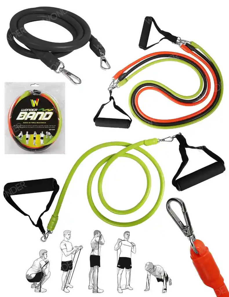 Material elástico resistente INCLUYE · 1 banda resistencia baja · 1 banda resistencia media · 1 banda resistencia alta · 2 agarres o manijas tubulares