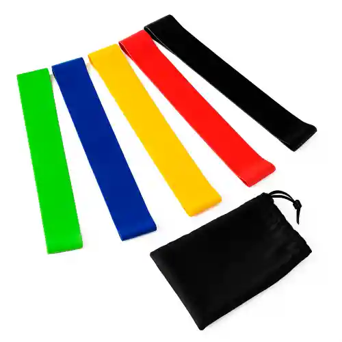 es un kit de 5 bandas cerradas diseñadas para entrenamiento de resistencia, tonificación y rehabilitación. Material: Fabricadas en TPE (elastómero termoplástico) o látex de alta calidad, lo que las hace duraderas, flexibles y fáciles de limpiar. Portabilidad: El kit incluye una bolsa de transporte (estuche) para facilitar su traslado al gimnasio o viajes. Versatilidad: Ideales para trabajar grupos musculares del tren superior e inferior, así como para ejercicios de yoga, pilates y fisioterapia.
