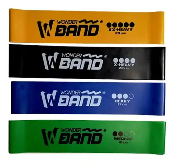 Medidas 25 cm de ancho x 5 cm de alto. El set contiene: • 1 Resistencia ultra color dorado, 28 libras de tensión • 1 Resistencia alta color negro 22 libras de tensión • 1 Resistencia media color azul 17 libras de tensión • 1 Resistencia baja color Verde 10 libras de tensión