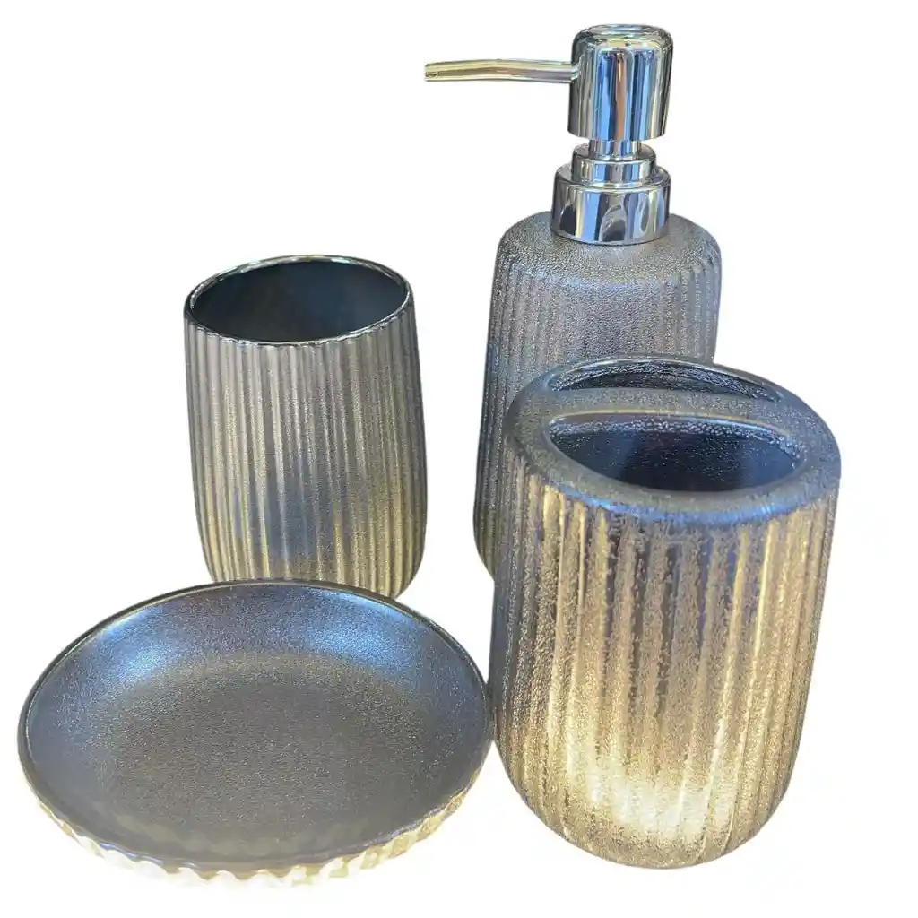 Diseño Metal con Textura Aspecto exquisito elegante y a la moda. Cerámica de alta calidad, suave al tacto y fácil de limpiar o limpiar residuos. 1 dispensador de jabón líquido 1 soporte para cepillo de dientes 1 jabonera 1 vaso Juego de accesorios de baño de cuatro piezas. Ayuda perfectamente a organizar tus cosas de baño con facilidad y mantenerlas limpias, ordenadas y hermosas.