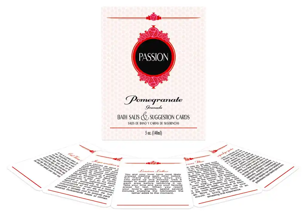 Es un romántico set de baño con aroma a granada que despierta los sentidos, aparte de ser aromático es relajante, y contiene agentes curativos de la piel, incluye 5 cartas impermeables con juegos eróticos y sugerencias para disfrutar en la bañera.
