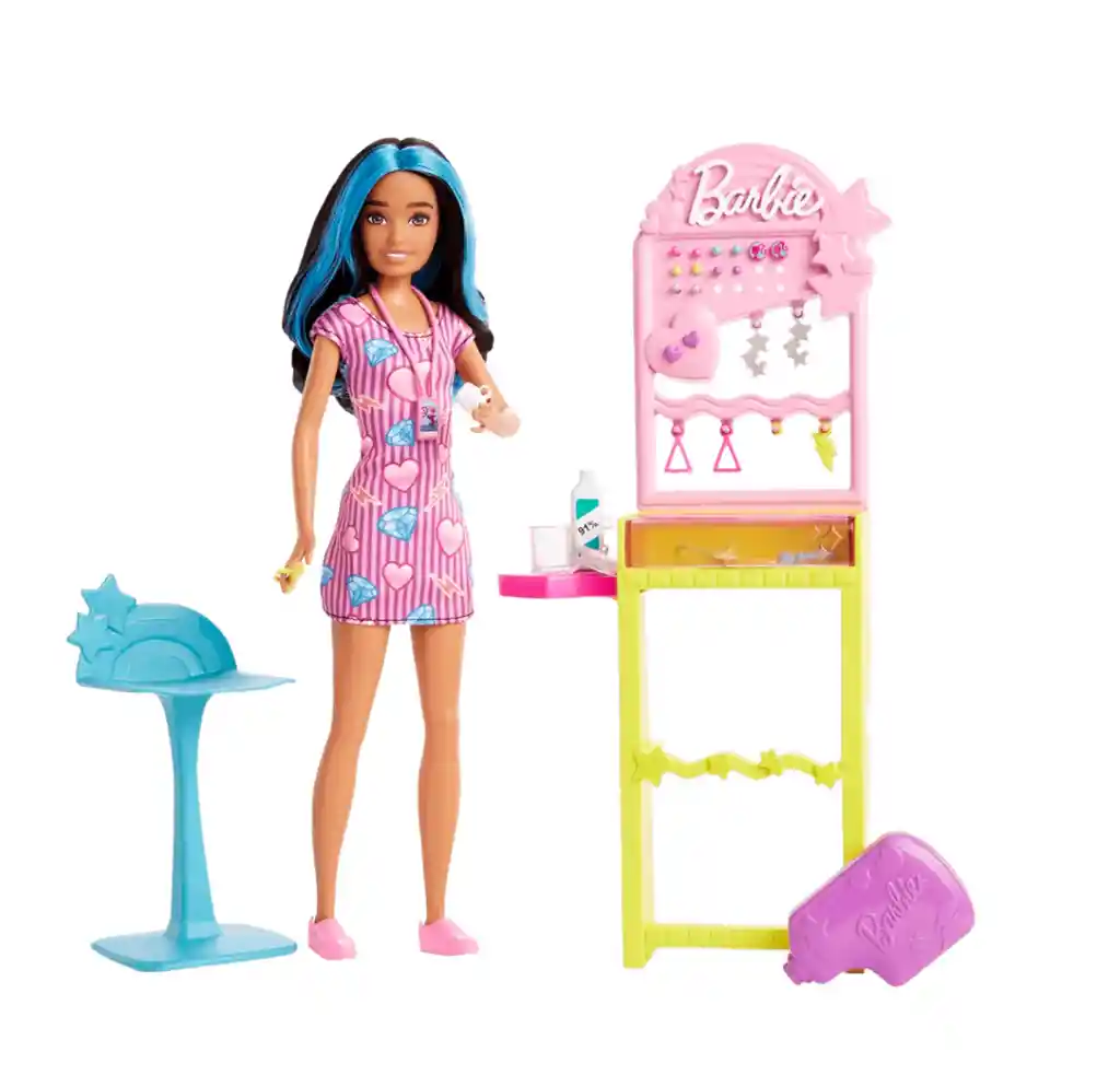 America Store te trae Set De Barbie Skipper Perforadora de Orejas HKD78 Las muñecas y sets de Barbie Skipper First Jobs permiten a las niñas explorar el mundo laboral con la hermana adolescente de Barbie. Inspirado en la película Skipper and the Big Babysitting Adventure, este set de Barbie mejora el currículum de la muñeca Skipper con un trabajo en un estudio de perforación de orejas. Las niñas pueden activar su imaginación en juegos de rol con una herramienta que “perfora” la oreja de la muñeca de juguete para agregar aretes ¡se incluyen 10 pares! Las niñas pueden exhibirlas en la base y recrear aventuras relacionadas con el trabajo con piezas de narrativa adicionales. Encuentra una gran variedad de juguetes para niñas como los diversos sets y muñecas Barbie que tenemos disponibles. ¡anímate ahora y lleva este fabuloso Set Barbie Skipper Perforadora de Orejas.!