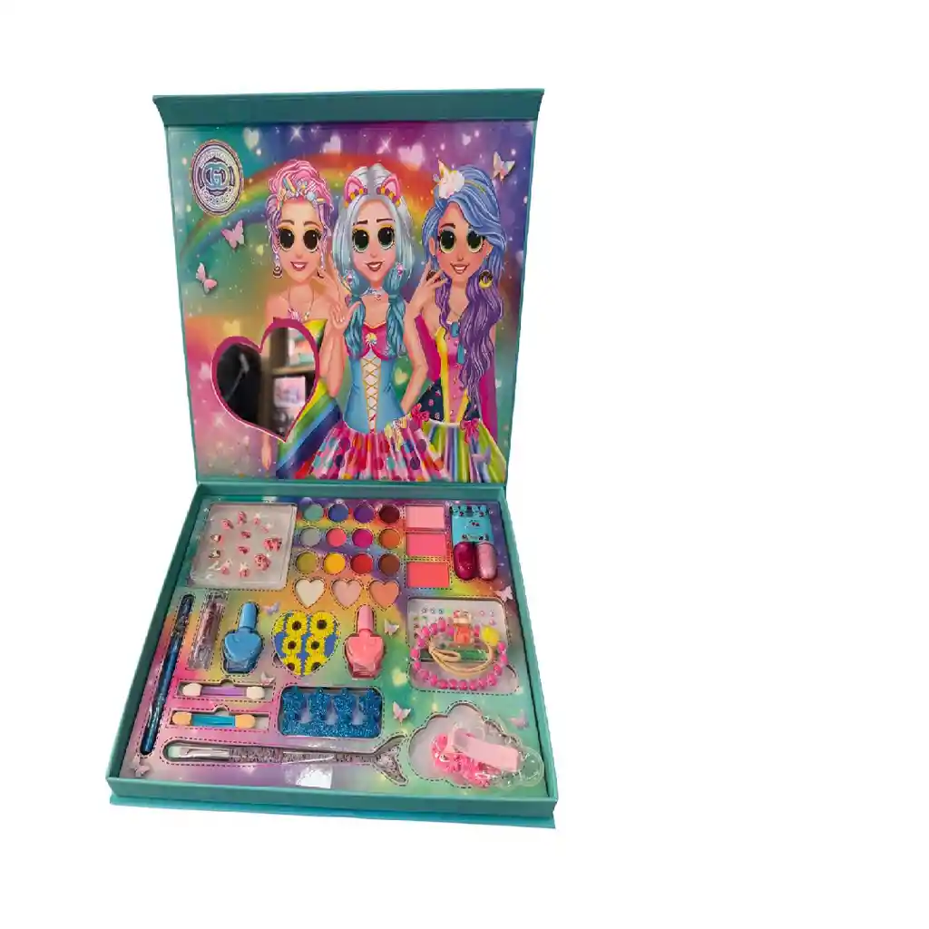 Set de belleza para niñas de 36 PCS con sombras, labiales, pinzas, brochas, brillo, esmaltes, stickers, espejo, pulseras, limas y uñas postizas. El maquillaje es lavable no toxico.