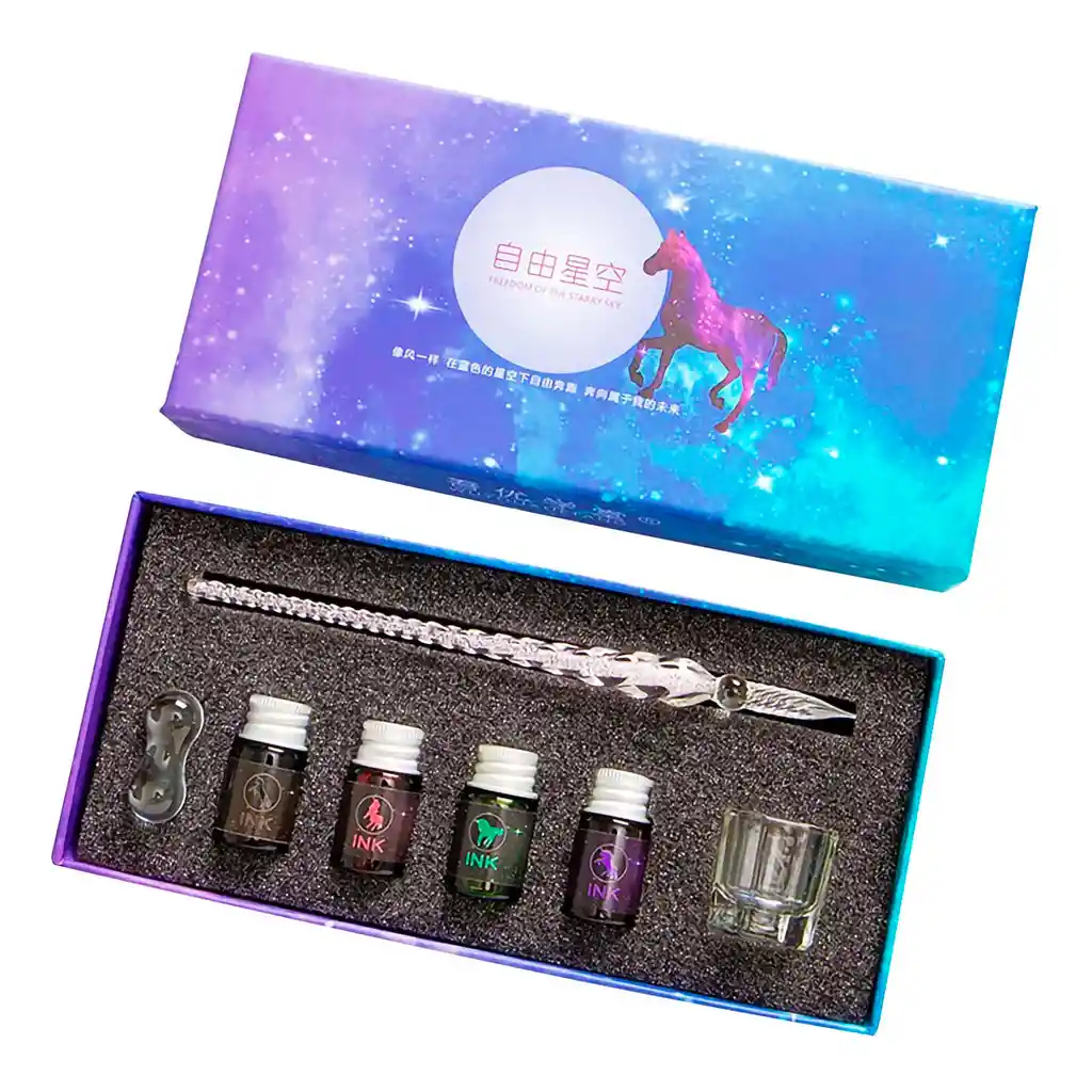 Set De Caligrafía X 4 Tintas + Base + Recipiente + Pluma De Vidrio. Increíble set de caligrafía que viene con una bella pluma de vidrio estilográfica, Este bolígrafo es de inmersión de tinta, el set viene con 4 frascos de tinta de diferente color cada uno ( Rojo, Verde, Azul, Violeta). Esta pluma es de alta calidad ideal para trabajos de caligrafía y escritura. Viene en estuche estampado del universo y unicornio. Contiene: 1 Pluma estilográfica de vidrio de alta calidad 4 tintas de colores surtidos(Rosa, verde, Azul, Violeta) 1 Reposa plumas de vidrio 1 Copa de vidrio.