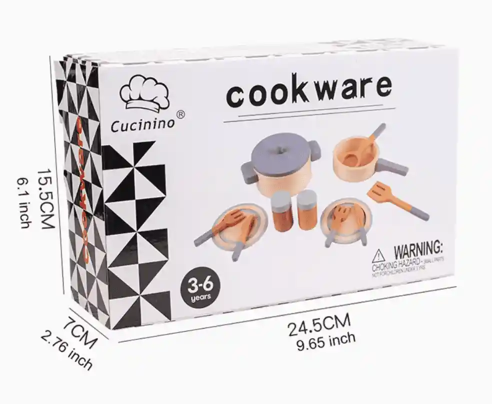 set de cocina infantil elaborado en madera, ideal para estimular el juego simbólico, la creatividad y la imaginación de los niños. Incluye olla con tapa, sartén, platos, utensilios y frascos, todos diseñados en tonos suaves y neutros, perfectos para un estilo minimalista y natural. Medidas aproximadas: Olla con tapa: 16.5 cm de diámetro x 6 cm de alto Sartén: 16.5 cm de largo Platos: 9.7 cm de diámetro Cucharón: 12.7 cm de largo Espátula: 12.7 cm de largo Tenedor y cuchillo: 9.3 cm de largo Frascos: 6.3 cm de alto x 3.4 cm de diámetro