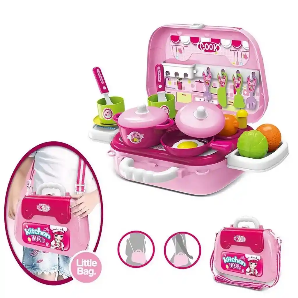 Diseño y Estructura Modo Maletín: El juguete es una maleta de color rosa y fucsia con el nombre "Kitchen Little". Tiene un asa blanca y una correa ajustable para que los niños puedan llevarlo colgado como un bolso o mochila. Modo Cocina: Al abrir el maletín, se transforma en una pequeña cocina con una superficie para cocinar, ganchos para utensilios y repisas laterales para organizar los accesorios. Accesorios Incluidos El set cuenta con varios elementos para el juego simbólico: Utensilios de cocina: Una olla fucsia con tapa blanca y una sartén con un huevo frito de juguete. Vajilla: Dos tazas verdes con platos pequeños y un juego de cubiertos (cuchara, tenedor, cuchillo y espátula) que se pueden colgar en el panel trasero. Alimentos de juguete: Se observan piezas que representan una naranja y un repollo o lechuga. Características Destacadas Portabilidad: Está diseñado para ser guardado y transportado fácilmente, lo que lo hace ideal para llevar a viajes o casas de amigos. Colores: Predominan los tonos rosa, magenta y verde brillante, con detalles decorativos que simulan una cocina real (como calcomanías de ventanas y estantes).