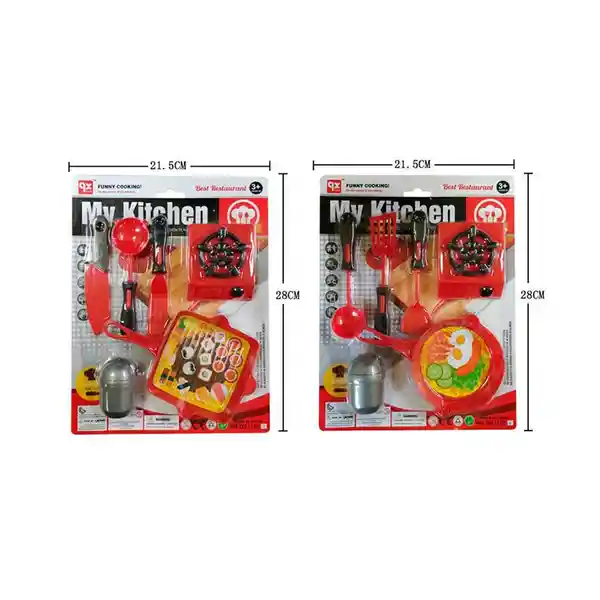 Set de Cocina en Blister - 2 Modelos Surtidos Incluye 6 Unidades. Accesorios de Cocina: Estufa 1 Und + Cubiertos Grandes 3 Und + Perol 1 Und + Salero 1 Und