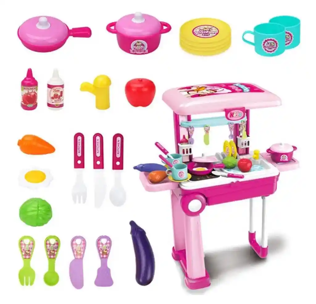 adopta plástico ABS ecológico, seguro y no tóxico. Los niños pueden participar plenamente en juegos de rol con pequeños amigos o padres y experimentar la alegría de cocinar. COLORES MÚLTIPLES: incluye accesorios de varios colores: vasos,legumbres, cuchillos, frutas, verduras y todas las fuentes están en diferentes colores para distinguirse fácilmente. Se adjuntan lindas pegatinas de colores que agregan más diversión y un sentido de realidad al juego. Además, los colores múltiples también pueden mejorar la percepción del color de los niños. PRÁCTICO Y PORTÁTIL: la maleta rosa con ruedas facilita su almacenamiento y transporte. La instalación y desinstalación serán sencillas con las instrucciones. ¡Llévalo y enriquece tus viajes aburridos con diversión!