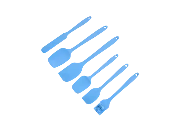 Set de utencilios de cocina X6 (espatula grande, espatula chica, cuchara grande, cuchara chica, brocha y miserable) Fabricados en silicona, son resistentes y duraderos. Cada utencilio tiene un orificio en el extremo del mango para colgarlos y guardarlos facilmente.