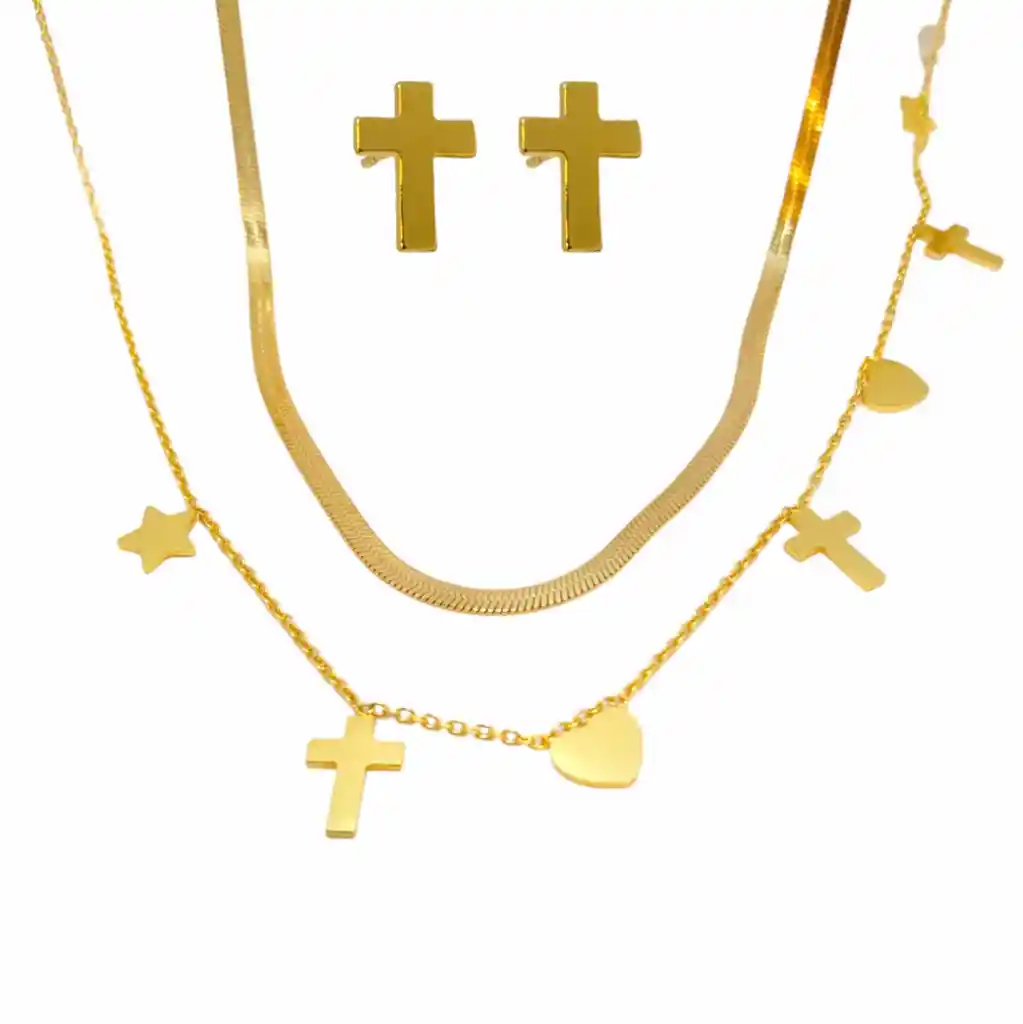 "Sumérgete en un mundo de elegancia estelar con nuestro deslumbrante set de collar y aretes. Este conjunto presenta dos cadenas exquisitamente detalladas: una tejida tipo serpiente, añadiendo un toque de lujo y textura, y la otra adornada con un collar de dijes de corazones y cruces, irradiando un encantador diseño. Los aretes complementan perfectamente el conjunto, con delicados topitos de cruz que añaden un toque de brillo sutil. Ya sea para una ocasión especial o para realzar tu estilo diario, este set te llevará de la elegancia cotidiana a la sofisticación en un abrir y cerrar de ojos." Su material es en acero quirurgico, permitiendo que sea un producto hipoalergenico, y que no cambie de color, para seguir resaltando su belleza.