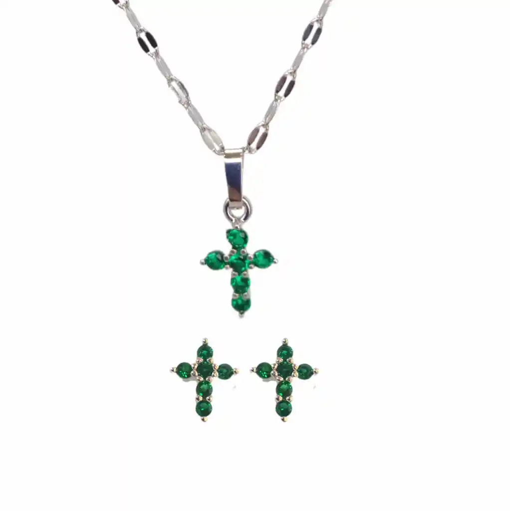 "Abraza tu fe con nuestro impresionante Set de Collar y Aretes de Cruz con Circonias Verdes. El collar presenta un llamativo colgante de cruz adornado con vibrantes circonias verdes, simbolizando renovación y crecimiento. Complementando el collar, los aretes repiten el diseño con delicados detalles de circonias verdes, añadiendo un toque de elegancia a cualquier conjunto. Este conjunto es más que solo joyería; es una hermosa expresión de fe y conexión espiritual, brindando una sensación de paz y serenidad a quienes lo llevan puesto." Su excelente material en Acero quirurgico, garantizara la durabilidad, y tiene la gran caracteristica de ser un producto antialergico.