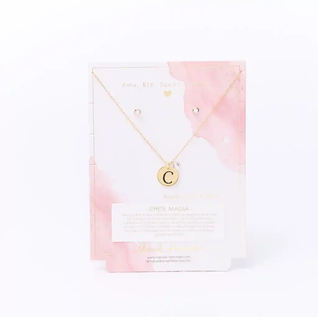 La cadena y los apliques dorados cuentan con Baño de Oro 18k. Elaborado con Cristales Swarovski. Longitud: 45 cm. Incluye Collar y Aretes.