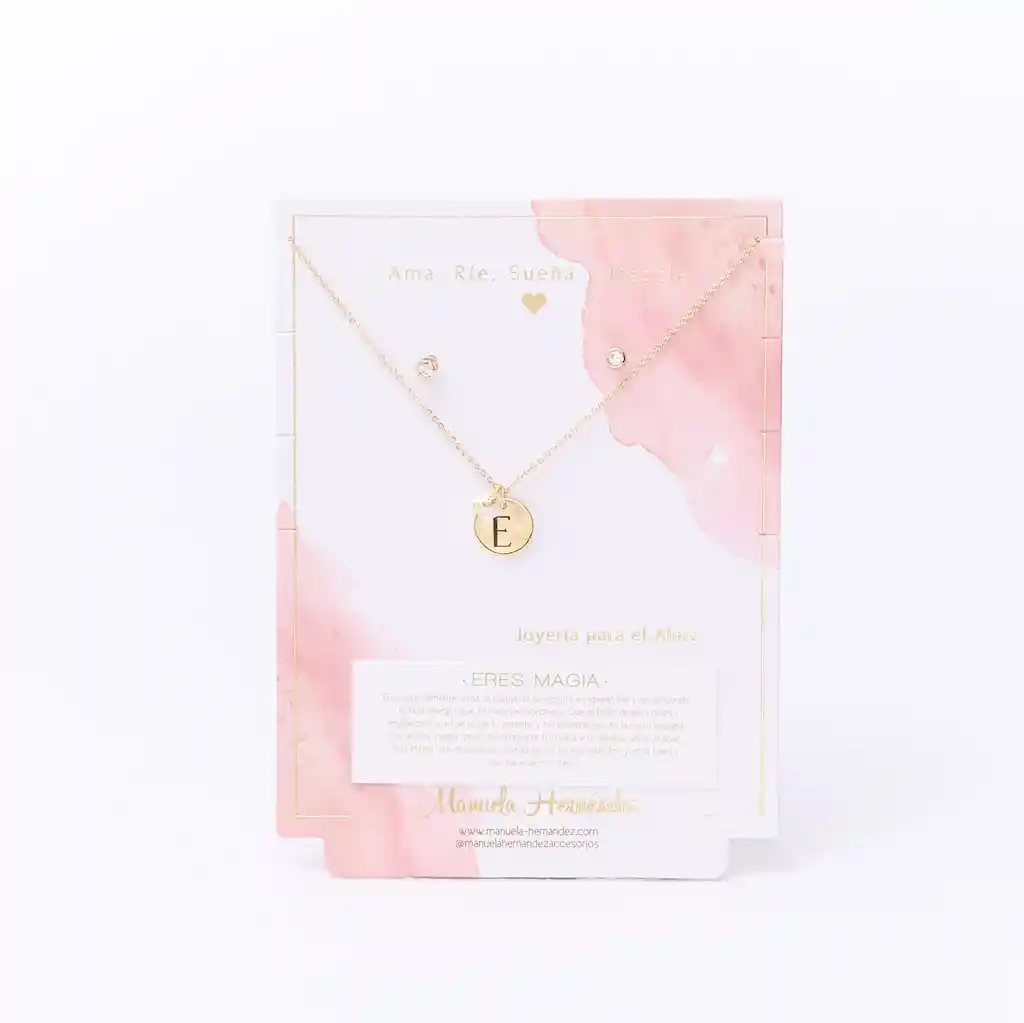 La cadena y los apliques dorados cuentan con Baño de Oro 18k. Elaborado con Cristales Swarovski. Longitud: 45 cm. Incluye Collar y Aretes.