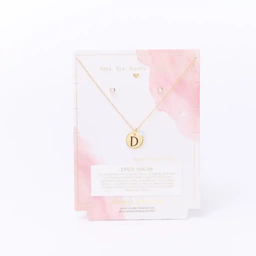La cadena y los apliques dorados cuentan con Baño de Oro 18k. Elaborado con Cristales Swarovski. Longitud: 45 cm. Incluye Collar y Aretes.