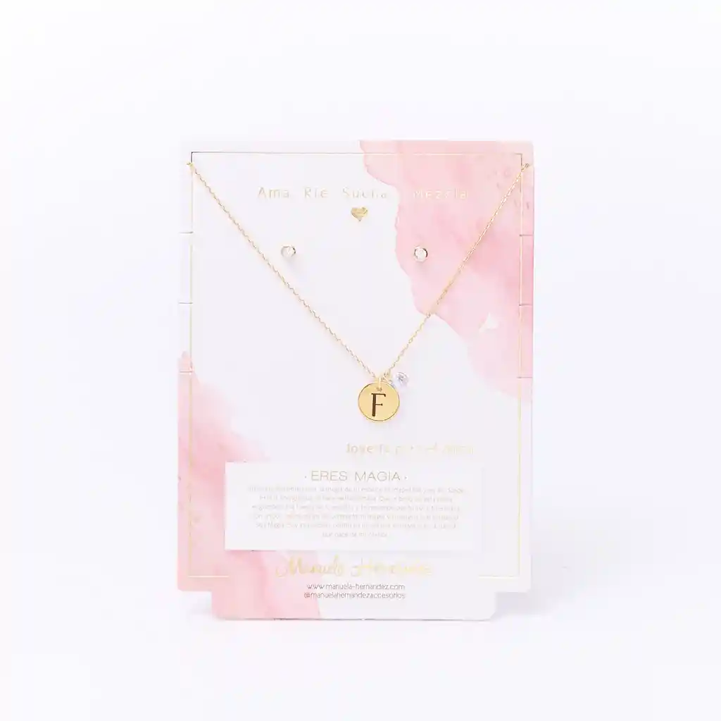La cadena y los apliques dorados cuentan con Baño de Oro 18k. Elaborado con Cristales Swarovski. Longitud: 45 cm. Incluye Collar y Aretes.