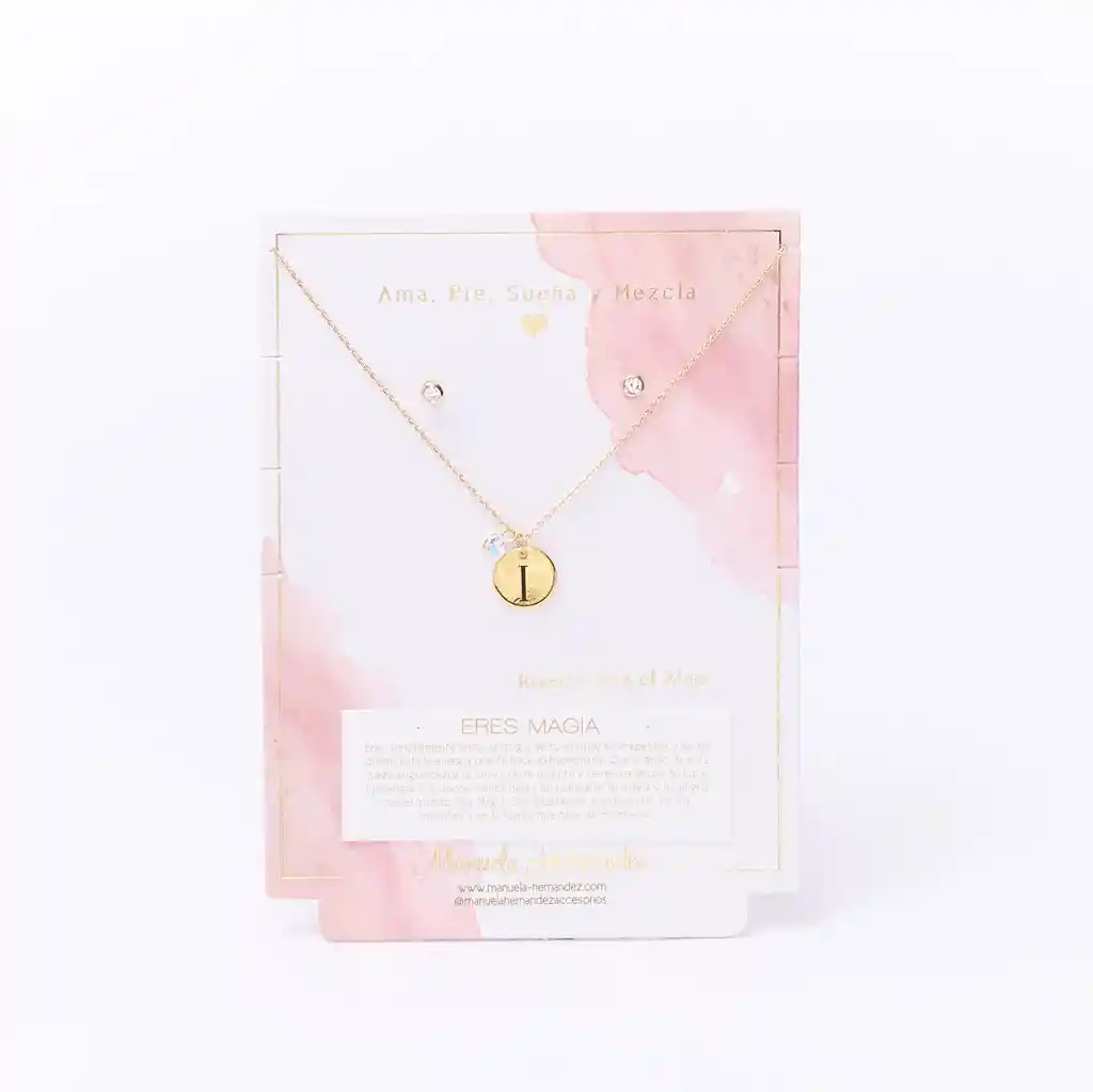 La cadena y los apliques dorados cuentan con Baño de Oro 18k. Elaborado con Cristales Swarovski. Longitud: 45 cm. Incluye Collar y Aretes.