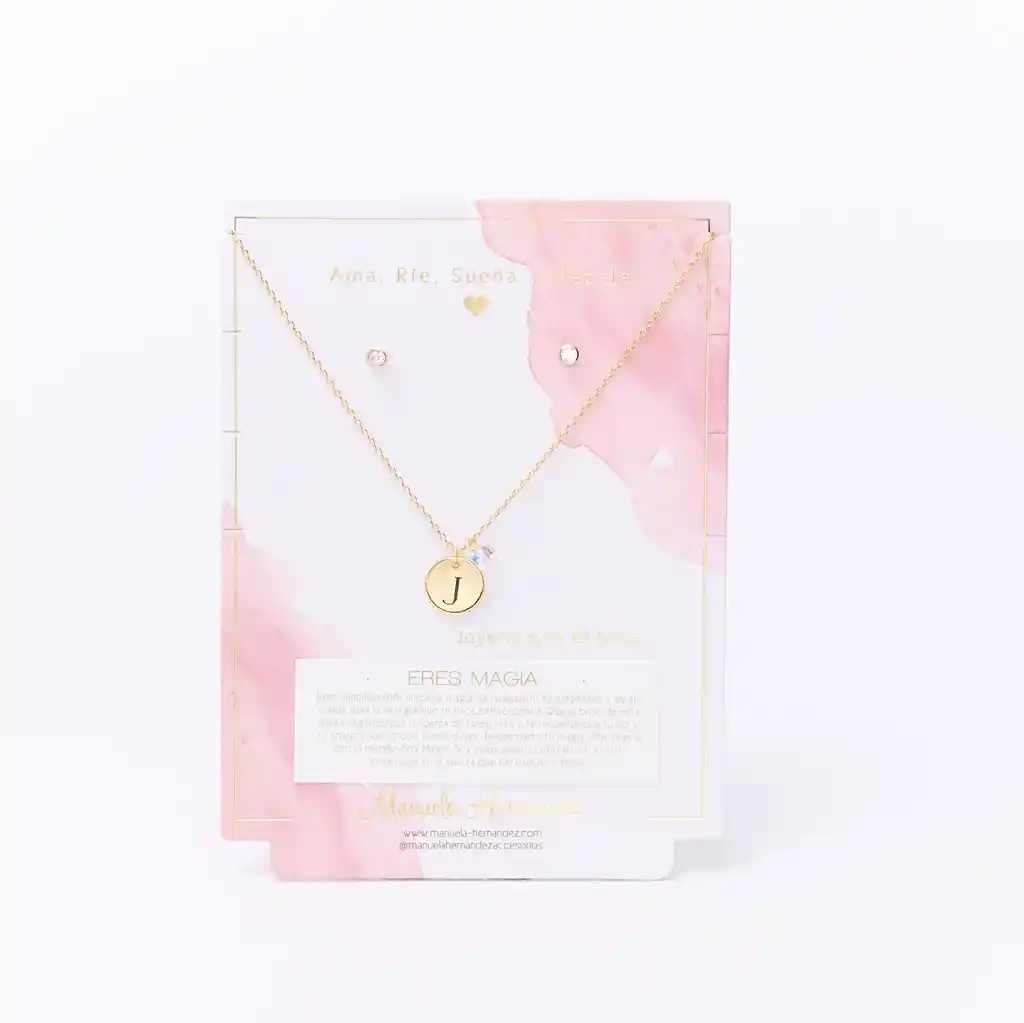 La cadena y los apliques dorados cuentan con Baño de Oro 18k. Elaborado con Cristales Swarovski. Longitud: 45 cm. Incluye Collar y Aretes.