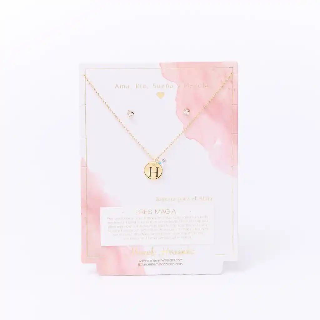 La cadena y los apliques dorados cuentan con Baño de Oro 18k. Elaborado con Cristales Swarovski. Longitud: 45 cm. Incluye Collar y Aretes.