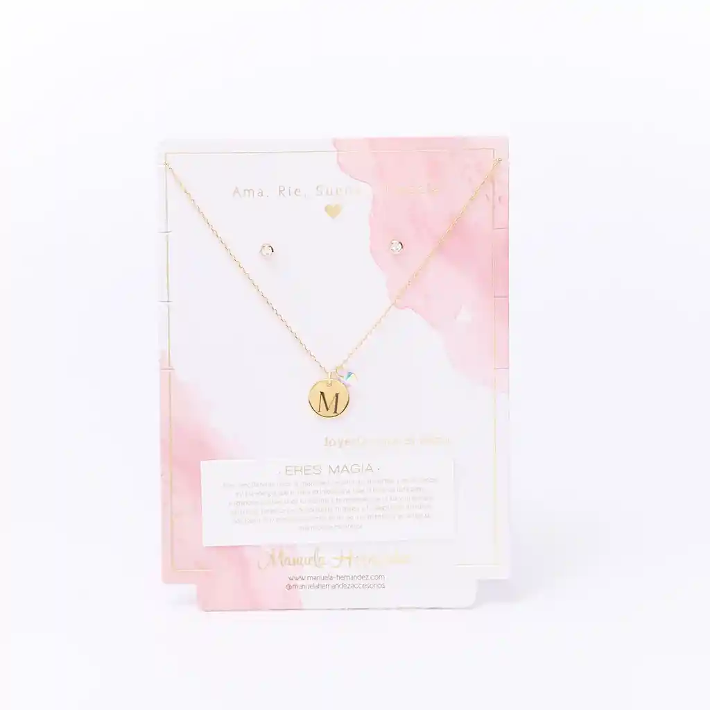 La cadena y los apliques dorados cuentan con Baño de Oro 18k. Elaborado con Cristales Swarovski. Longitud: 45 cm. Incluye Collar y Aretes.