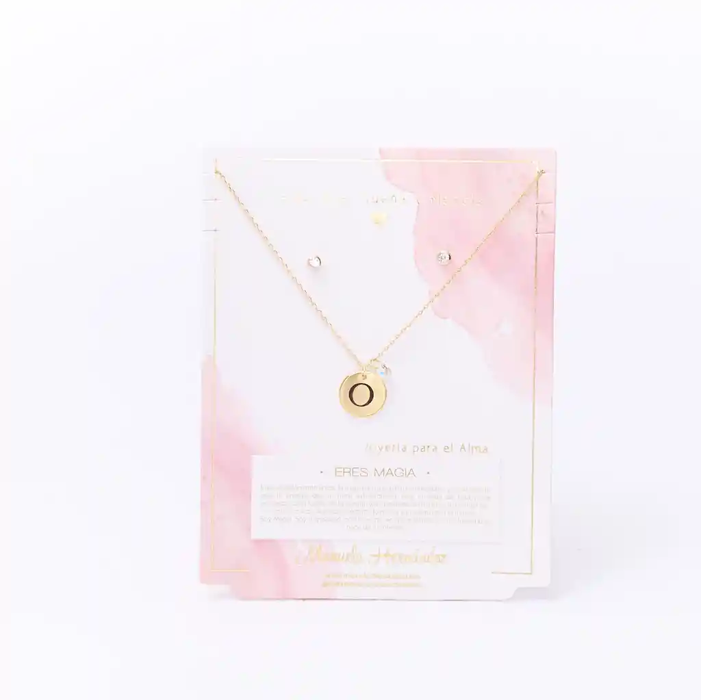 La cadena y los apliques dorados cuentan con Baño de Oro 18k. Elaborado con Cristales Swarovski. Longitud: 45 cm. Incluye Collar y Aretes.