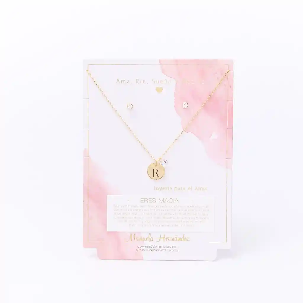 La cadena y los apliques dorados cuentan con Baño de Oro 18k. Elaborado con Cristales Swarovski. Longitud: 45 cm. Incluye Collar y Aretes.