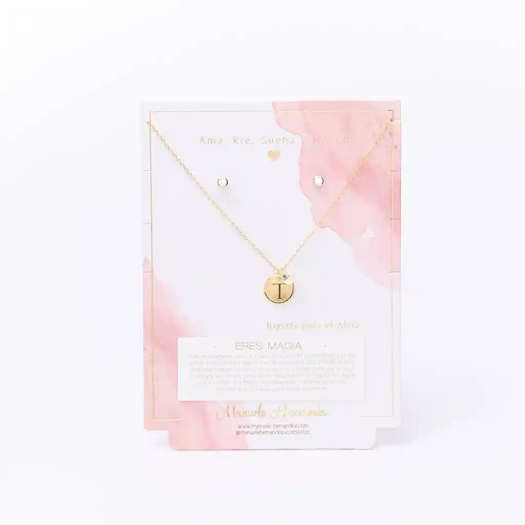 La cadena y los apliques dorados cuentan con Baño de Oro 18k. Elaborado con Cristales Swarovski. Longitud: 45 cm. Incluye Collar y Aretes.