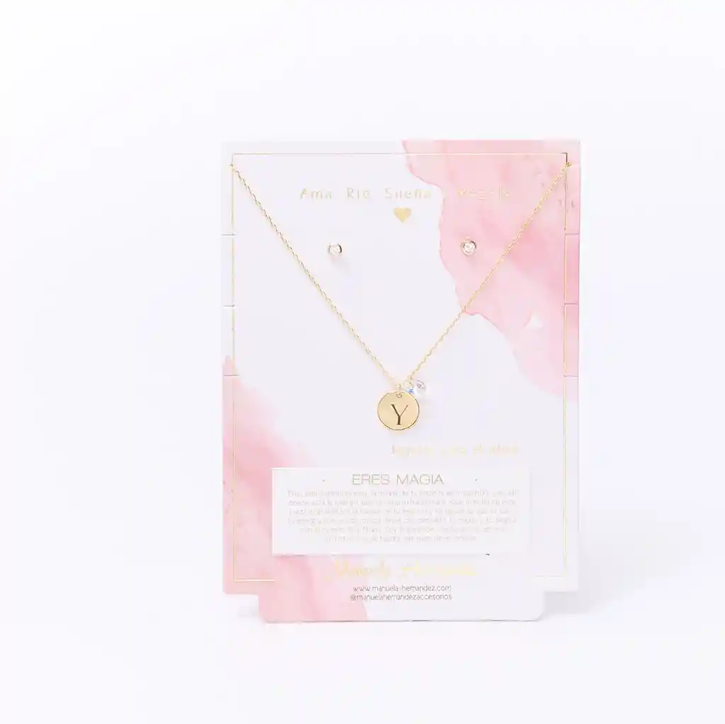 La cadena y los apliques dorados cuentan con Baño de Oro 18k. Elaborado con Cristales Swarovski. Longitud: 45 cm. Incluye Collar y Aretes.