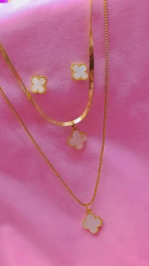 Set de collar y aretes en fantasía fina, con elegante diseño de trébol estilo Van Cleef (cuatro hojas) ✨🍀. Un accesorio delicado y sofisticado que aporta un look clásico, femenino y atemporal, ideal para uso diario o ocasiones especiales. 🔔 Importante 📌 Fantasía fina – estilo Van Cleef 📌 Diseño trébol / cuatro hojas 📌 Puede llegar en colores surtidos según disponibilidad 📌 No es resistente a la humedad 📌 Si no se expone a agua, humedad o perfumes, el producto tiene una larga duración