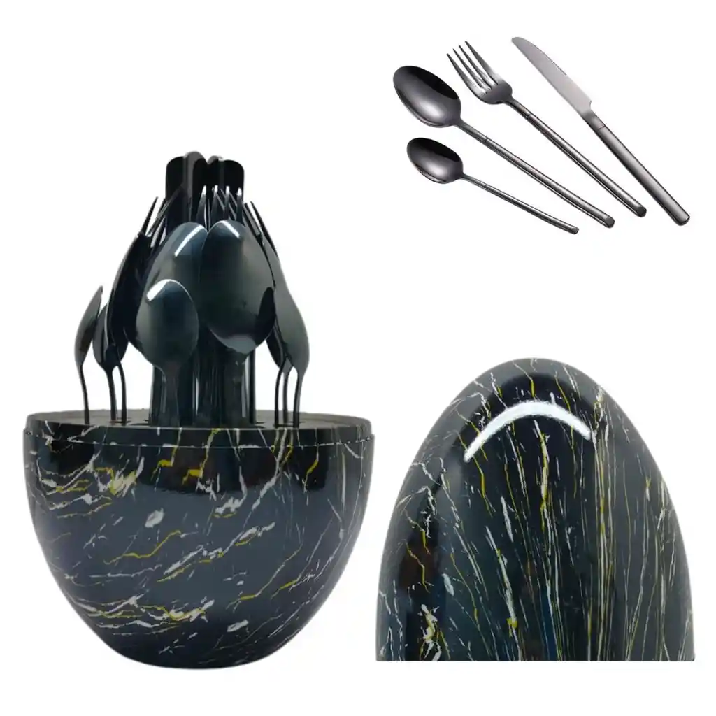 Acero inoxidable de alta calidad: este juego de cubiertos está hecho de acero inoxidable de grado alimenticio de alta calidad que es muy duradero, a prueba de óxido, resistente a la corrosión, no tóxico, libre de BPA, sin sabor a metal. Mientras tanto, su robustez garantiza que no se doble fácilmente, lo que te proporciona un uso a largo plazo. Lo más importante, son aptos para lavavajillas. Forma elegante: nuestra caja de almacenamiento en forma de huevo y todos los cubiertos están hechos de acero inoxidable brillante de alta calidad, lujoso y duradero, en el medio hay un soporte con grano de madera de imitación, tiene la función de drenar el agua para garantizar la limpieza de la vajilla. Las formas únicas también se pueden utilizar para la exhibición artística. Contenido incluido: este producto te proporciona cubiertos para 6 personas, incluyendo 7 juegos de cubiertos, tenedor y cuchara. Cada pieza es de excelente mano de obra con detalles exquisitos. Fácil de limpiar, pero no apto para entornos agresivos y limpiadores agresivos. Exquisita mano de obra: bordes lisos altamente pulidos de espejo que garantizan la seguridad de tus labios. Nuestro juego de cubiertos está diseñado para añadir más elegancia y clase a tu mesa. Tiene un diseño clásico que permite mezclar y combinar con tus cubiertos existentes para elevar las comidas diarias en una experiencia gastronómica fina. Amplio uso: el juego de cubiertos es adecuado para la familia, fiestas, oficina, cafetería, hotel, campamento, cena de vacaciones y uso diario. Se utiliza para beber café, comer yogur, postres, ensalada de frutas, helados, mini pasteles, filetes, etc. También se puede utilizar como cuchara de sandía, cucharadita, cuchara de café, cuchara de azúcar, tenedor de frutas, cuchillo de mesa, tenedor de pastel, etc. La cuchara de pala se puede utilizar como herramientas para jardines pequeños. Es un buen regalo para amigos y familiares, y es una vajilla imprescindible para la familia.