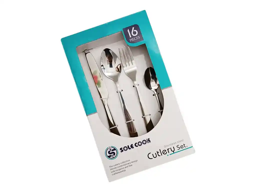 Marca: Sole Cook Material: Acero inoxidable Contenido: 16 piezas (cuchillos, tenedores, cucharas y cucharillas) Características: Combina diseño contemporáneo con elegancia y artesanía fina.