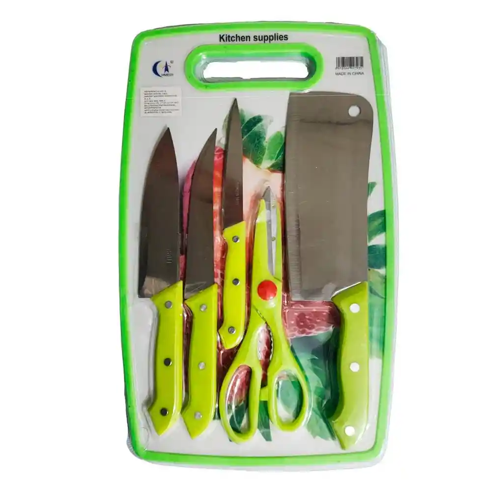 Completo set de utensilios de cocina que incluye tres cuchillos de diferentes tamaños, cuchilla tipo hacha y tijeras multiusos, todos con mangos ergonómicos de color verde que ofrecen comodidad y seguridad al usarlos; un kit práctico y funcional ideal para facilitar el corte, picado y preparación de alimentos en el hogar. Ficha Técnica: Dimensiones : 37 cm x 23 cm x 3 cm Material: Acero Inoxidable / Plastico Referencia: 437-5 ** _Para defectos de fábrica o retractos: \_Por favor revise el producto apenas lo reciba y antes de usarlo. No aplican ley de retracto o defectos de fábrica luego de usar el producto. Se manejan máximo 5 días para reportar defectos de fábrica (por ejemplo, producto funciona mal, piezas faltantes, rotas, etc). Para hacer efectiva la devolución el producto debe devolverse con el empaque original, el cual debe estar en buen estado, incluir todos los documentos y las partes completas y sin daños.