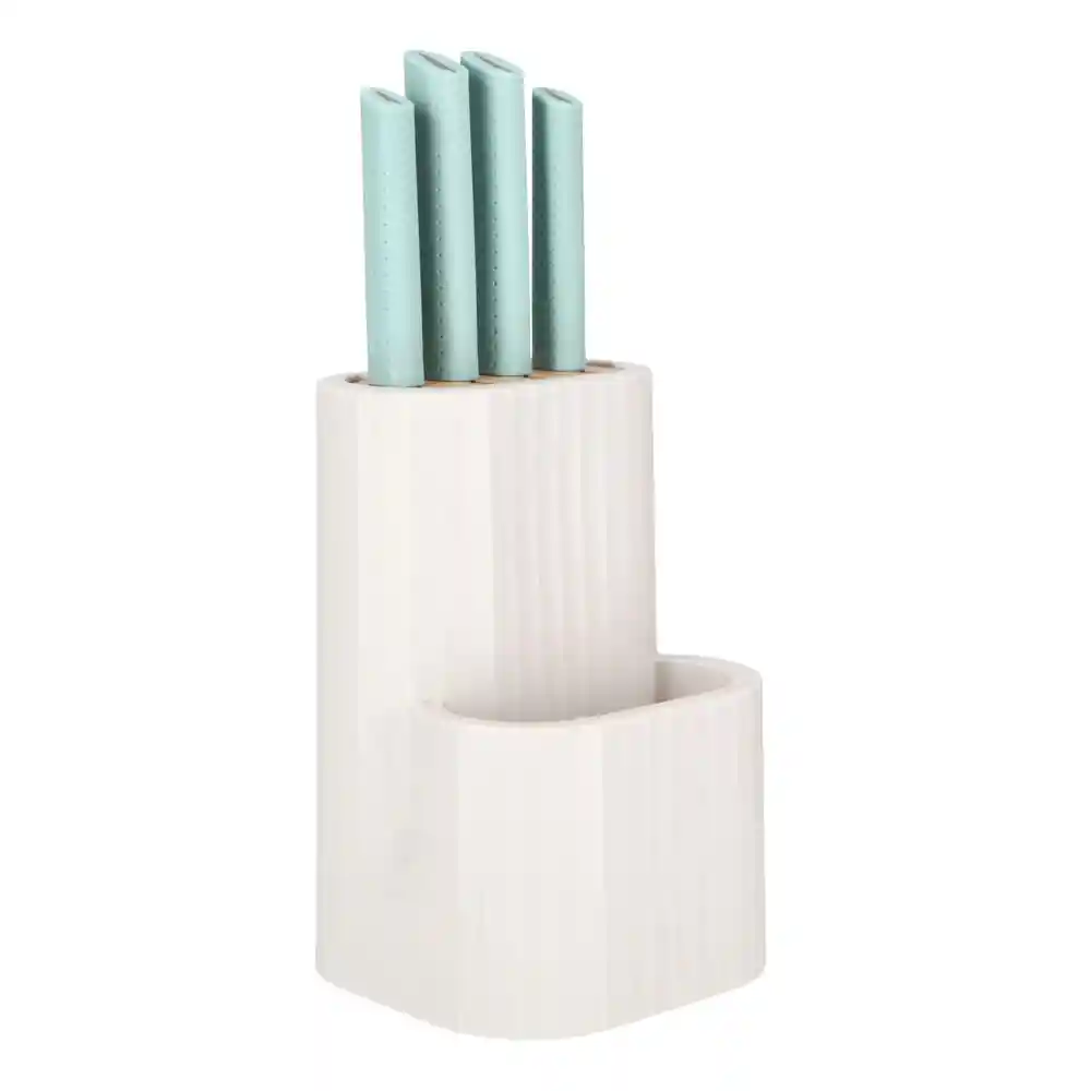 Set Incluye: Cuchillos de Acero Inoxidable Con Mango de Goma Antideslizante 4 Und + Base de Plástico Polipropileno y Madera 1 Und. Para Para Organizar Los Cuchillos y Utensilios de Cocina. Cuchillo Pelador; Cuchillo Vegetales; Cuchillo Santoku; Cuchillo Chef. Alto: 33.6 cm. Ancho: 14.3 cm. Profundidad: 14.1 cm. Composición: Polipropileno (Pp) Acero Inoxidable Madera Caucho Termoplástico (Tpr). "En Casaideas Encontrarás Artículos de Diseño; Para Vivir Día a Día en un Espacio Que te Haga Feliz."