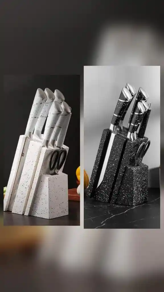 Eleva tu experiencia culinaria con este set de cuchillos de 8 piezas, diseñado para combinar estilo y funcionalidad en tu cocina. Ideal para chefs profesionales y aficionados, este set te proporcionará las herramientas necesarias para realizar cortes perfectos. * Diseño Ergonómico: Los mangos cómodos aseguran un agarre seguro y firme, minimizando la fatiga durante su uso prolongado. * Hojas de Alta Calidad: Fabricadas en acero inoxidable, garantizando durabilidad y precisión en cada corte. * Base Estable y Elegante: La base antideslizante proporciona estabilidad y organiza tus cuchillos de manera segura y estética. Disponible blanco o negro