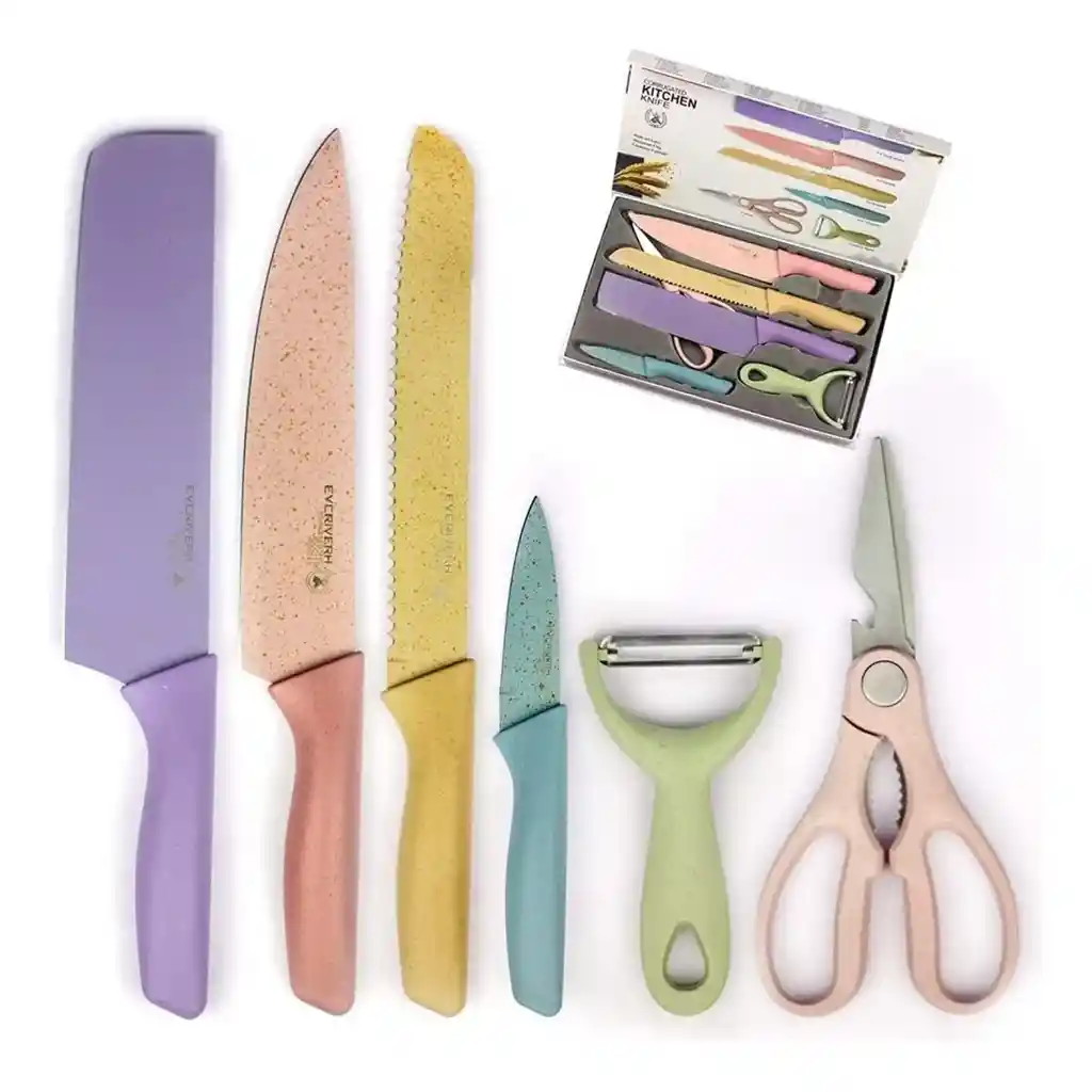 El juego que se muestra generalmente incluye los siguientes utensilios: Cuchillo de chef: Un cuchillo grande multiusos. Cuchillo para pan: Con borde dentado. Cuchillo de pelar / utilitario: Cuchillos más pequeños para tareas detalladas. Pelador de verduras: Un pelador de cerámica para frutas y verduras. Tijeras de cocina: Tijeras multiusos, a veces con funciones adicionales como abridor de botellas. Características Principales Hojas de Acero Inoxidable: Las hojas son de acero inoxidable con alto contenido de carbono, resistentes a manchas y corrosión. Recubrimiento de Cerámica: Cuentan con un recubrimiento de cerámica que facilita el corte y evita que los alimentos se adhieran a la hoja. Mangos Ergonómicos: Los mangos están diseñados para un agarre seguro y cómodo. Colores Vibrantes: Cada utensilio presenta un color pastel diferente, lo que añade un toque de estilo a la cocina.