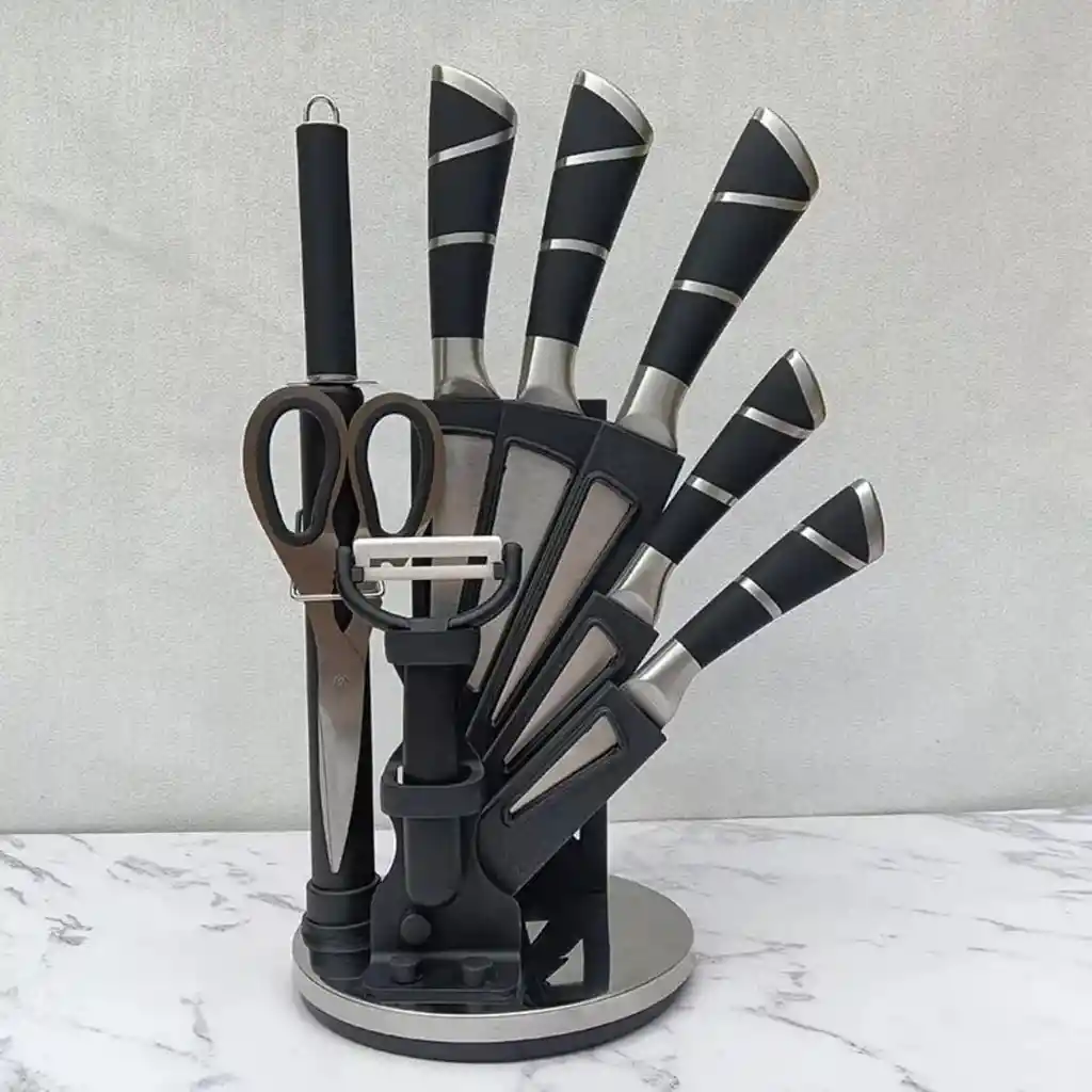Juego Cuchillos Acero Inoxidable x 8 piezas + base Hojas gruesas y duraderas Mango duradero y hergonométrico con terminación mate fácil de limpiar Hojas en Acero Inoxidable resistente a manchas y a la corrosión incluye herramienta de afilado y tijeras para cocina. •Fabricados en acero al calor brindan mejor corte. Incluye 5 cuchillos Mango ergonómico de seguridad fabricado en carbonato. (no se desliza) Práctica base organizadora Lo que obtienes con tu compra 5 x Cuchillos 1 x Afilador 1 x Tijeras 1 x Revanador 1 x Base Giratoria