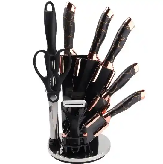 Juego de cuchillos de 9 piezas con diseño elegante y funcional Mango con patrón agrietado único que proporciona un agarre cómodo y seguro. Cabezales de doble chapado que refuerzan la estabilidad del mango para mayor durabilidad. Fabricados con acero inoxidable de alta calidad, resistentes a la corrosión y al desgaste. Versatilidad en la cocina Incluye cuchillos para todas las necesidades culinarias: chef, pan, utilitario, fruta y más. Afila tus cuchillos con la chaira de 12 pulgadas incluida para un rendimiento de corte óptimo. Tijeras y pelador versátiles que complementan las funciones de corte y preparación de alimentos. Fácil mantenimiento y almacenamiento Se limpia fácilmente con un paño húmedo y detergente suave. Se recomienda secar bien cada pieza antes de colocarla en el soporte acrílico. Diseño que ahorra espacio y mantiene la cocina organizada y elegante. Diseño moderno y ergonómico Mango de material PP antideslizante que evita el cansancio en manos tras un uso prolongado. Soporte acrílico transparente que brinda un toque sofisticado a la cocina. NOTA: Garantía de 30 días por desperfecto de fábrica, no daños humanos.
