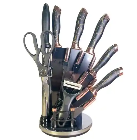 Set de cuchillos de 9 piezas para todo tipo de cocina Fabricados con acero inoxidable de alta resistencia para cortes precisos y duraderos. Mango ergonómico con patrón agrietado que mejora el agarre y la seguridad. Cabezales reforzados con doble chapado para mayor estabilidad y control. Incluye todo lo necesario para la preparación de alimentos Cuchillo de chef de 8" ideal para carnes, pescados y verduras. Cuchillo panadero de 8" con sierra para cortar pan sin aplastarlo. Cuchillo utilitario de 5" y cuchillo de fruta de 3.5" para tareas más delicadas. Fácil limpieza y almacenamiento seguro Superficie antiadherente que facilita la limpieza con solo un paño húmedo. Soporte acrílico transparente que mantiene cada cuchillo en su lugar. Organiza tu cocina de manera práctica y con un diseño estilizado. Calidad y diseño sofisticado Mango de PP antideslizante para un agarre cómodo y seguro. Accesorios adicionales como afilador, tijeras y pelador para mayor funcionalidad. NOTA: Garantía de 30 días por desperfecto de fábrica, no daños humanos.