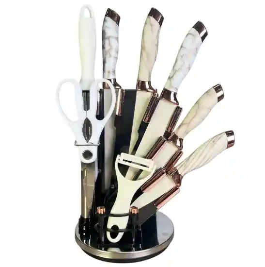 Set de cuchillos de 9 piezas para todo tipo de cocina Fabricados con acero inoxidable de alta resistencia para cortes precisos y duraderos. Mango ergonómico con patrón agrietado que mejora el agarre y la seguridad. Cabezales reforzados con doble chapado para mayor estabilidad y control. Incluye todo lo necesario para la preparación de alimentos Cuchillo de chef de 8" ideal para carnes, pescados y verduras. Cuchillo panadero de 8" con sierra para cortar pan sin aplastarlo. Cuchillo utilitario de 5" y cuchillo de fruta de 3.5" para tareas más delicadas. Fácil limpieza y almacenamiento seguro Superficie antiadherente que facilita la limpieza con solo un paño húmedo. Soporte acrílico transparente que mantiene cada cuchillo en su lugar. Organiza tu cocina de manera práctica y con un diseño estilizado. Calidad y diseño sofisticado Mango de PP antideslizante para un agarre cómodo y seguro. Accesorios adicionales como afilador, tijeras y pelador para mayor funcionalidad. NOTA: Garantía de 30 días por desperfecto de fábrica, no daños humanos.
