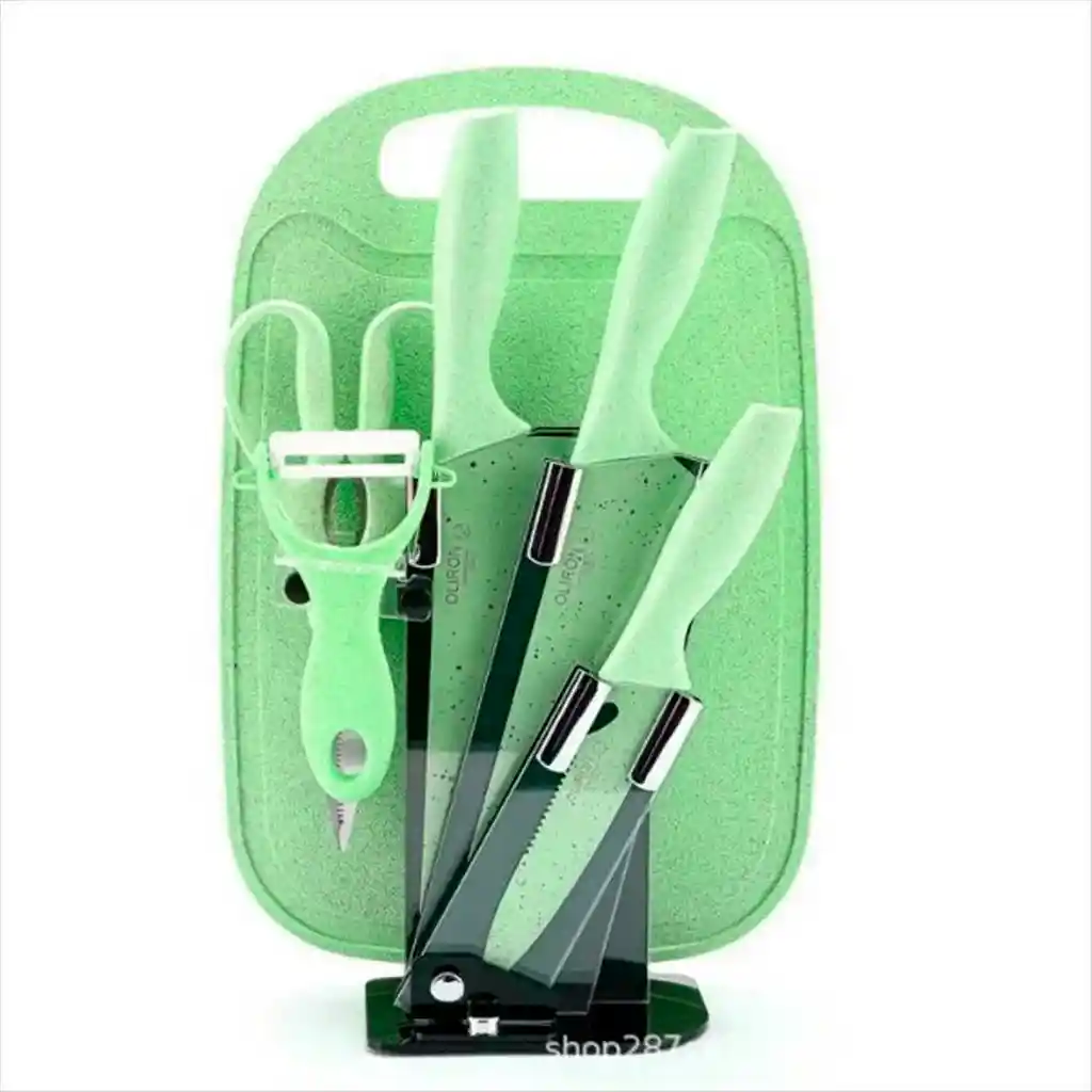 Este set de cuchillos y utensilios de cocina de 6 piezas es una opción funcional y estilizada para equipar tu cocina con herramientas esenciales. Incluye tres cuchillos de acero inoxidable de alto carbono con revestimiento antiadherente, un pelador de papas, tijeras para carne, una tabla para picar y un pedestal acrílico organizador que optimiza el espacio. Las hojas afiladas y resistentes garantizan cortes precisos, mientras que los mangos ergonómicos de fibra de pasto de trigo ofrecen un agarre cómodo y seguro, reduciendo la fatiga durante su uso. Su diseño multicolor aporta un toque vibrante a la cocina, y su fácil limpieza lo convierte en un set práctico y duradero, ideal para preparar todo tipo de alimentos con eficiencia. Ficha Técnica: Material: Acero Inoxidable Cantidad de Piezas: 6 Uso: Cocina ** _Para defectos de fábrica o retractos: \_Por favor revise el producto apenas lo reciba y antes de usarlo. No aplican ley de retracto o defectos de fábrica luego de usar el producto. Se manejan máximo 5 días para reportar defectos de fábrica (por ejemplo, producto funciona mal, piezas faltantes, rotas, etc). Para hacer efectiva la devolución el producto debe devolverse con el empaque original, el cual debe estar en buen estado, incluir todos los documentos y las partes completas y sin daños.