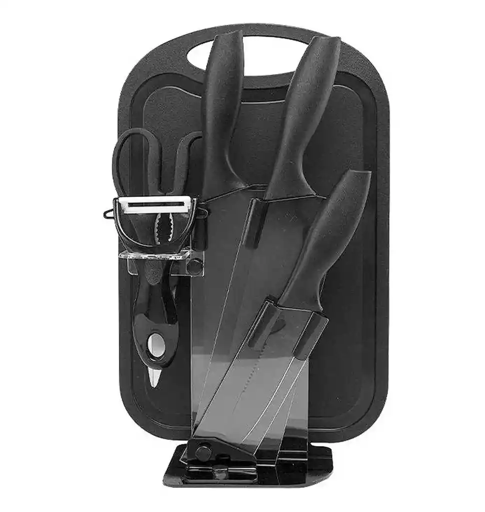 Este set de cuchillos y utensilios de cocina de 6 piezas es una opción funcional y estilizada para equipar tu cocina con herramientas esenciales. Incluye tres cuchillos de acero inoxidable de alto carbono con revestimiento antiadherente, un pelador de papas, tijeras para carne, una tabla para picar y un pedestal acrílico organizador que optimiza el espacio. Las hojas afiladas y resistentes garantizan cortes precisos, mientras que los mangos ergonómicos de fibra de pasto de trigo ofrecen un agarre cómodo y seguro, reduciendo la fatiga durante su uso. Su diseño multicolor aporta un toque vibrante a la cocina, y su fácil limpieza lo convierte en un set práctico y duradero, ideal para preparar todo tipo de alimentos con eficiencia. Ficha Técnica: Material: Acero Inoxidable Cantidad de Piezas: 6 Uso: Cocina ** _Para defectos de fábrica o retractos: \_Por favor revise el producto apenas lo reciba y antes de usarlo. No aplican ley de retracto o defectos de fábrica luego de usar el producto. Se manejan máximo 5 días para reportar defectos de fábrica (por ejemplo, producto funciona mal, piezas faltantes, rotas, etc). Para hacer efectiva la devolución el producto debe devolverse con el empaque original, el cual debe estar en buen estado, incluir todos los documentos y las partes completas y sin daños.
