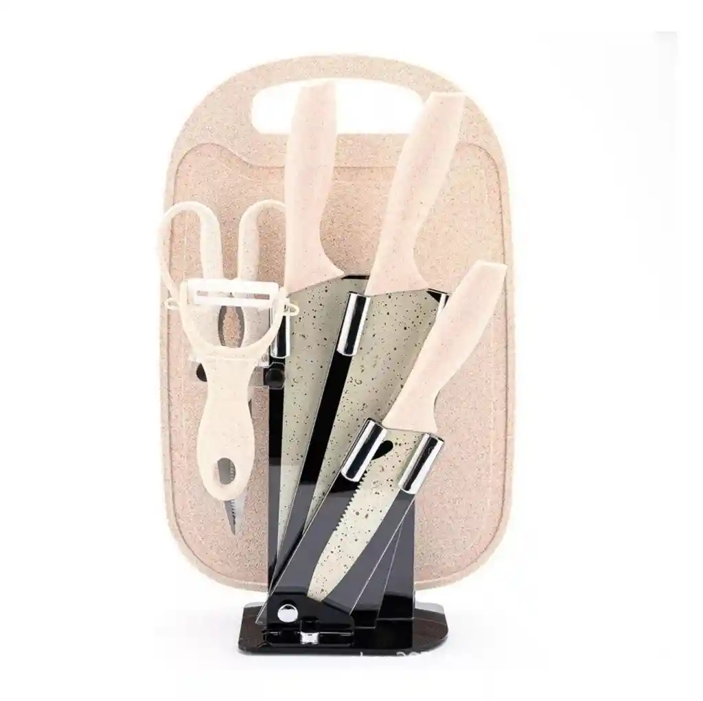 Este set de cuchillos y utensilios de cocina de 6 piezas es una opción funcional y estilizada para equipar tu cocina con herramientas esenciales. Incluye tres cuchillos de acero inoxidable de alto carbono con revestimiento antiadherente, un pelador de papas, tijeras para carne, una tabla para picar y un pedestal acrílico organizador que optimiza el espacio. Las hojas afiladas y resistentes garantizan cortes precisos, mientras que los mangos ergonómicos de fibra de pasto de trigo ofrecen un agarre cómodo y seguro, reduciendo la fatiga durante su uso. Su diseño multicolor aporta un toque vibrante a la cocina, y su fácil limpieza lo convierte en un set práctico y duradero, ideal para preparar todo tipo de alimentos con eficiencia. Ficha Técnica: Material: Acero Inoxidable Cantidad de Piezas: 6 Uso: Cocina ** _Para defectos de fábrica o retractos: \_Por favor revise el producto apenas lo reciba y antes de usarlo. No aplican ley de retracto o defectos de fábrica luego de usar el producto. Se manejan máximo 5 días para reportar defectos de fábrica (por ejemplo, producto funciona mal, piezas faltantes, rotas, etc). Para hacer efectiva la devolución el producto debe devolverse con el empaque original, el cual debe estar en buen estado, incluir todos los documentos y las partes completas y sin daños.