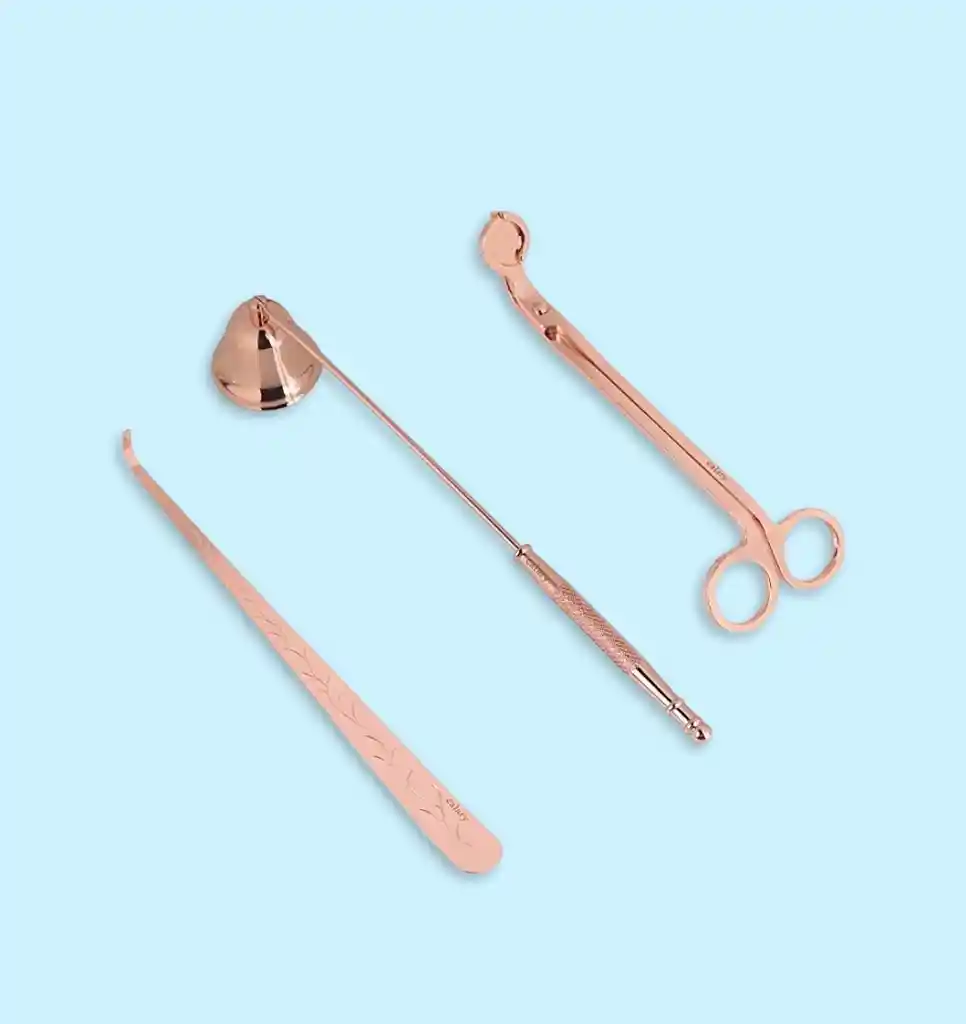 Set de cuidado para velas - Contiene 3 accesorios: corta mechas, apaga vela y dipper mechas - Material: acero inoxidable - Color: oro rosa