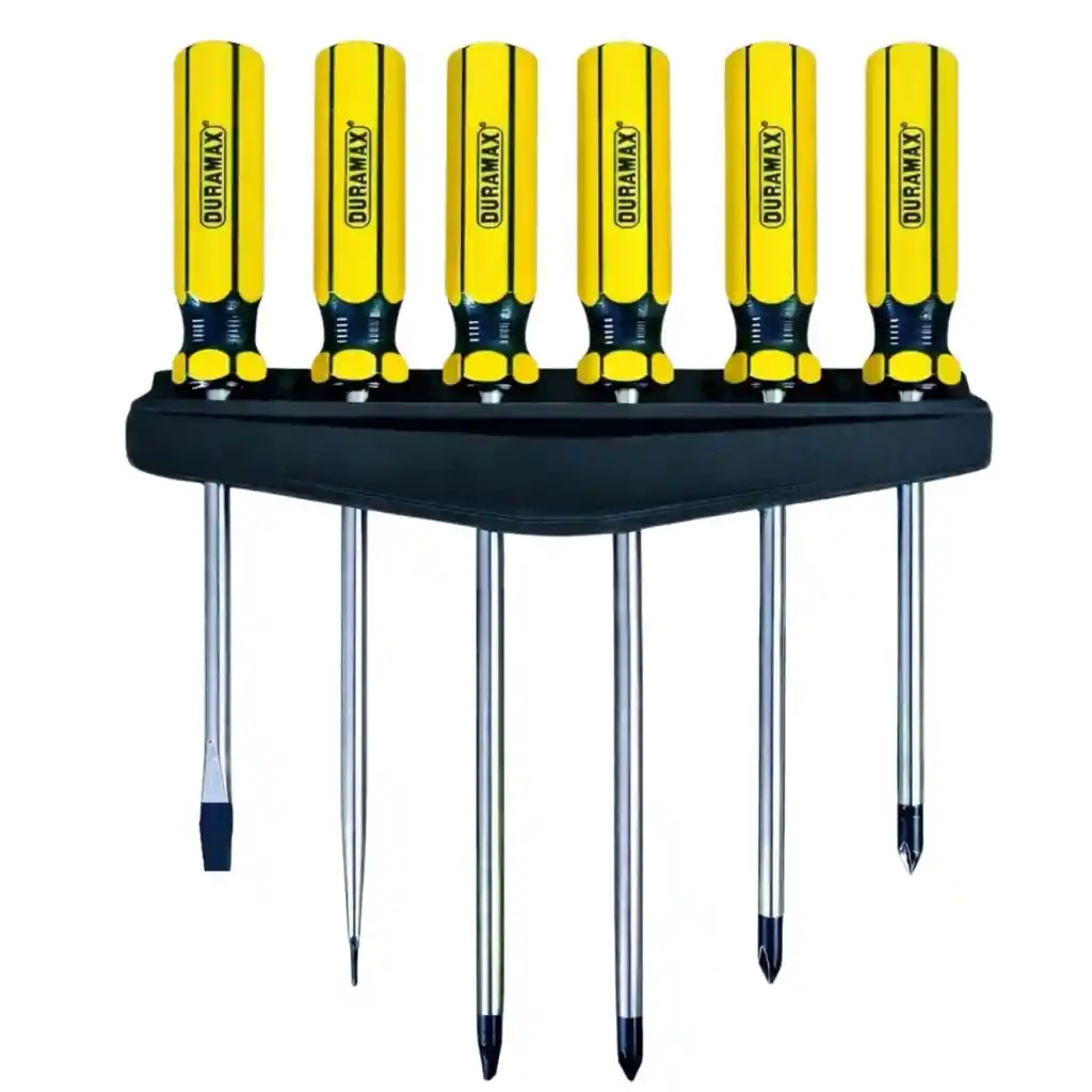 El Set de 6 destornilladores DURAMAX ofrece versatilidad y resistencia para trabajos mecánicos, eléctricos y de uso doméstico. Diseñado con mangos ergonómicos en colores amarillo y negro, garantiza un agarre firme y cómodo durante cada tarea. 🔵 Características Principales 🔹 Incluye 6 piezas: 3 planos y 3 de estrella (Phillips). 🔹 Medidas variadas: 3", 4" y 6" para adaptarse a diferentes necesidades. 🔹 Mangos ergonómicos: diseño antideslizante que mejora la precisión y seguridad. 🔹 Material resistente: puntas duraderas que aseguran mayor vida útil. 🔹 Organizador incluido: soporte práctico para mantener las herramientas ordenadas. 🔵 Beneficios 🔹 Ideal para reparaciones en el hogar, oficina o taller. 🔹 Diferentes tamaños y puntas para mayor versatilidad. 🔹 Diseño profesional que combina comodidad y durabilidad. 🔹 Fácil almacenamiento y transporte gracias al soporte integrado.