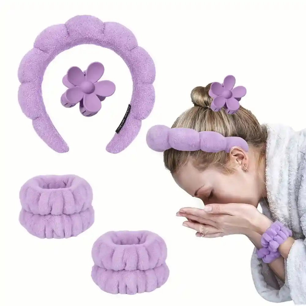 Set de Balaca Acolchada Puffy para Skincare – Suave, Cómoda y Elegante Incluye: 1 set de balaca acolchada, muñequeras antigoteo y caimán en color lila. Disfruta de tu rutina de cuidado facial con total comodidad gracias a esta balaca acolchada para skincare, diseñada para mantener el cabello perfectamente recogido mientras aplicas tus productos favoritos. Su textura suave y esponjosa es ideal para uso diario, maquillaje, limpieza facial, mascarillas, spa en casa o tratamientos de belleza. No aprieta, no maltrata el cabello y se adapta cómodamente a diferentes tamaños de cabeza. Características principales: - Material suave y acolchado, agradable al tacto - Diseño ergonómico tipo burbuja - No deja marcas ni genera presión - Ideal para skincare, maquillaje y rutinas de belleza - Fácil de lavar y de secado rápido - Apta para todo tipo de cabello Un accesorio imprescindible para tu rutina diaria de belleza. Compra ahora y eleva tu experiencia de skincare con comodidad y estilo. En Lifeglow Store, iluminamos tu vida con productos que inspiran y potencian tu bienestar.