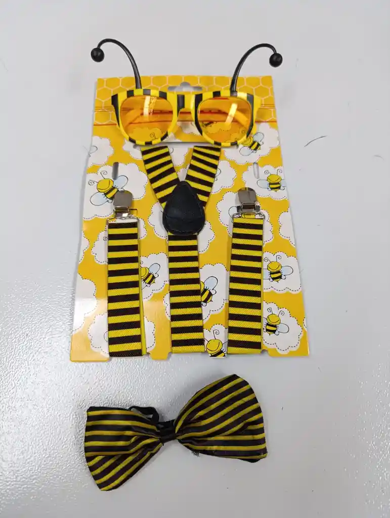 Divertido set de disfraz estilo abejita, perfecto para fiestas, presentaciones y disfraces infantiles. Incluye tirantes rayados en negro y amarillo, moño a juego, lentes amarillos y antenitas decorativas. Ideal para destacar con un look alegre y original. 🖤💛✨