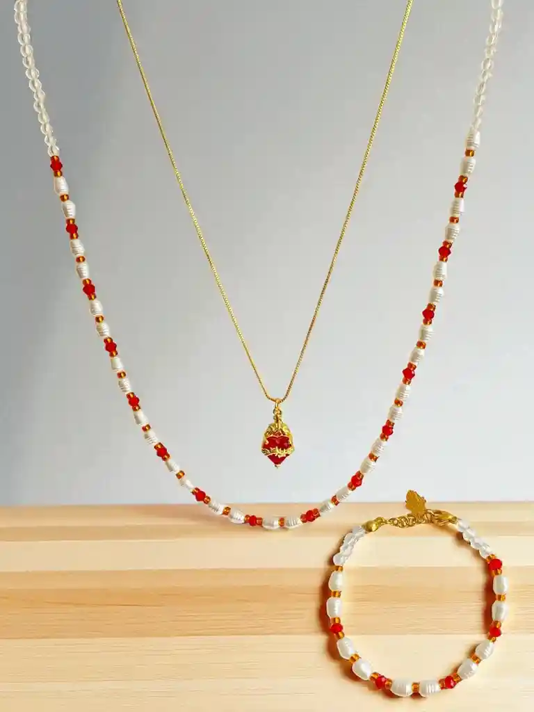 Set de doble cadena en rodio con corazon de fuego y manilla (3 piezas) J8