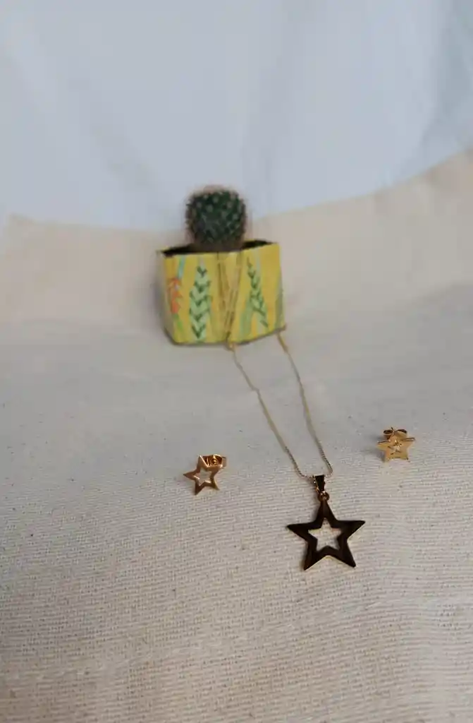 Set de gargantilla y topitos en acero, la estrella es un símbolo que en muchas culturas representa “la gran madre” protectora de las aguas y las cosechas. viene en una caja de de lujo en cartón kraft amigable con el medio ambiente.